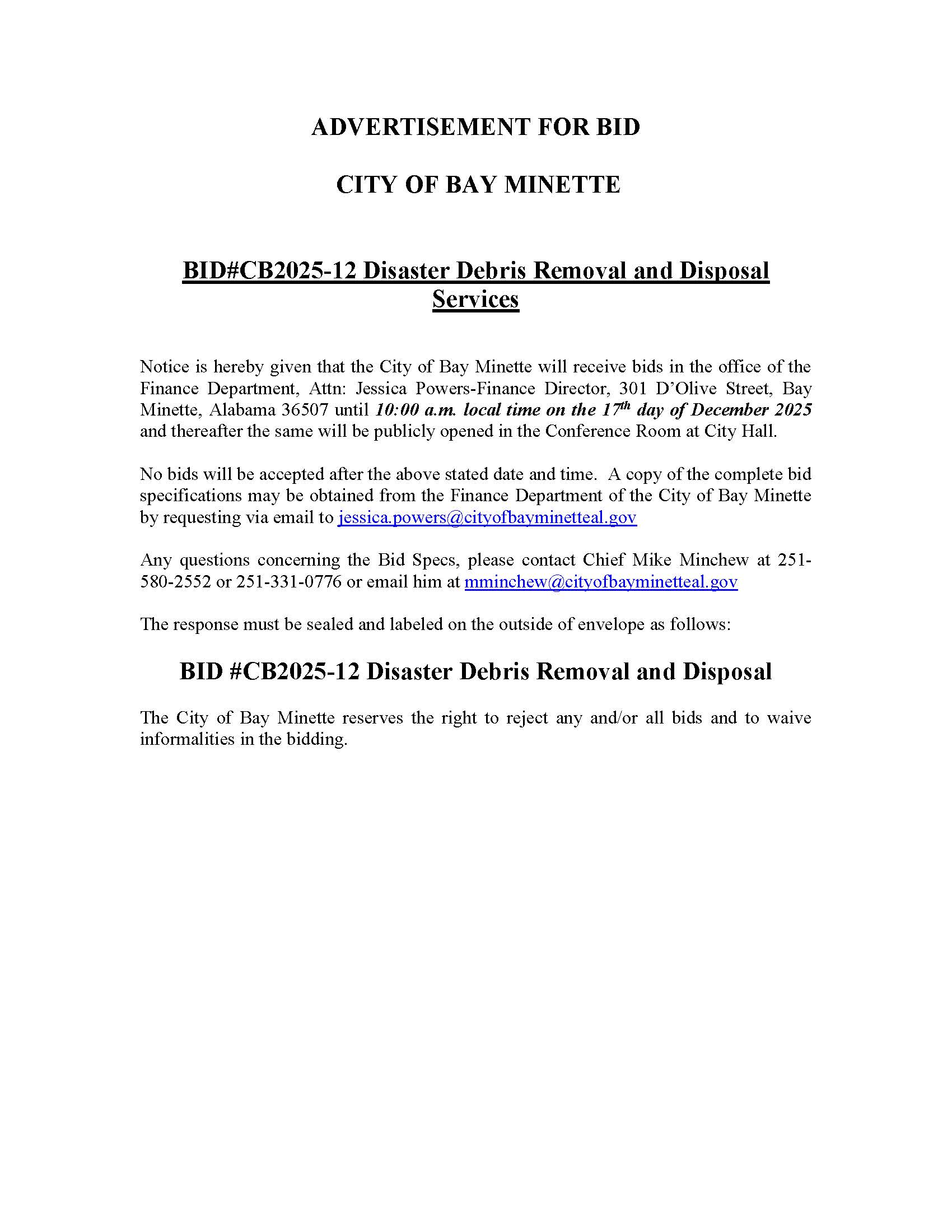 ADVERTISMENT FOR BID-Debris Removal and Disposal