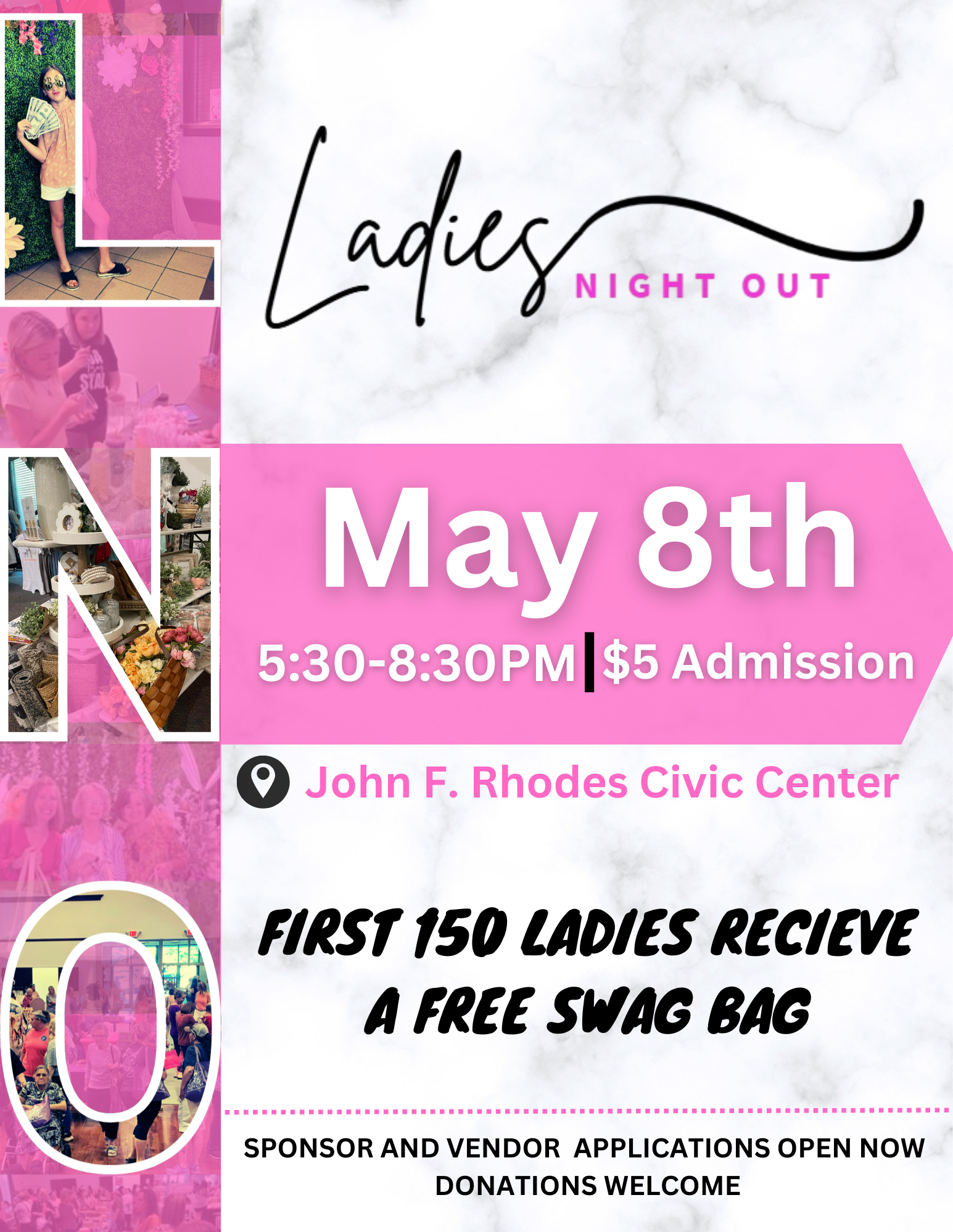 Ladies Night Out John F. Rhodes Civic Center May 8, 2026 5:30 p.m. until 8:30 p.m. Admission $5