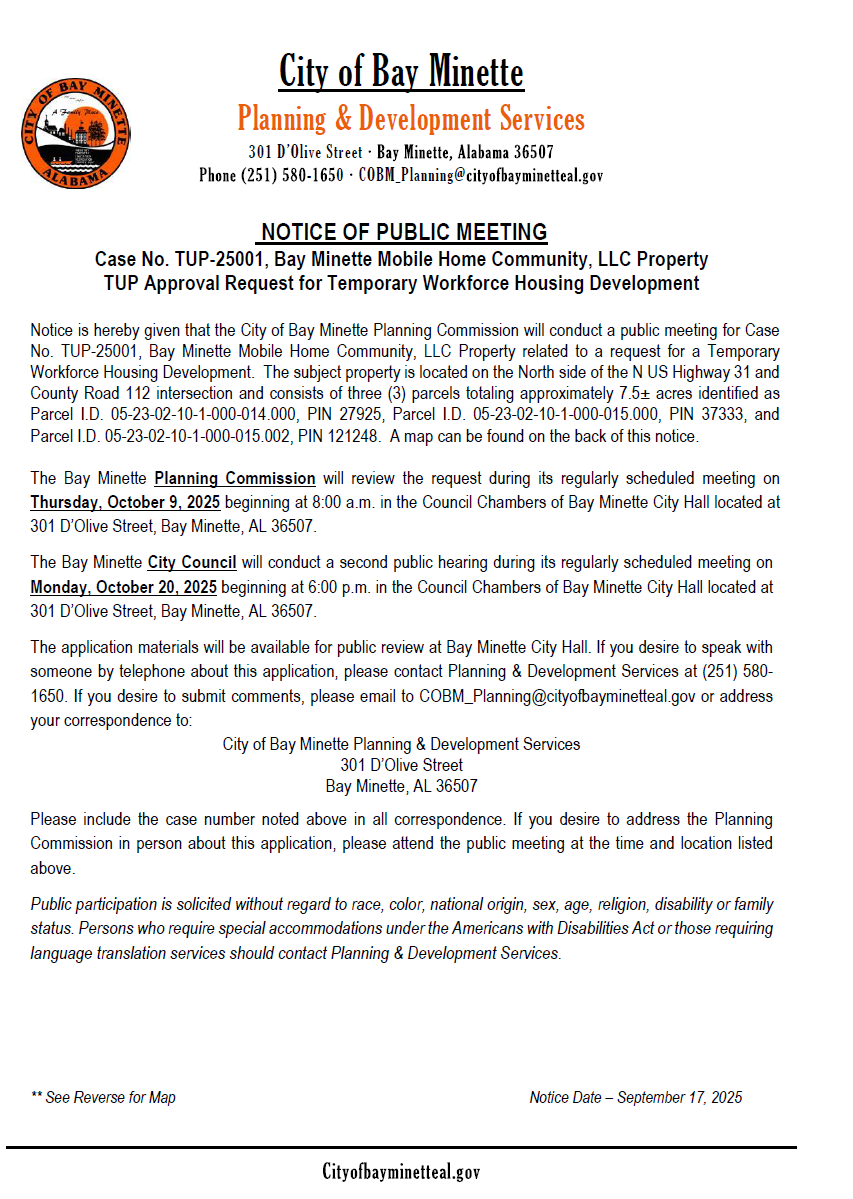 | Ordinance 1060 | Authorizing the Sale of City of Bay Minette Unneeded Property Located at 611-613 McMeans Ave to Bay Minette Development Group, LLC |